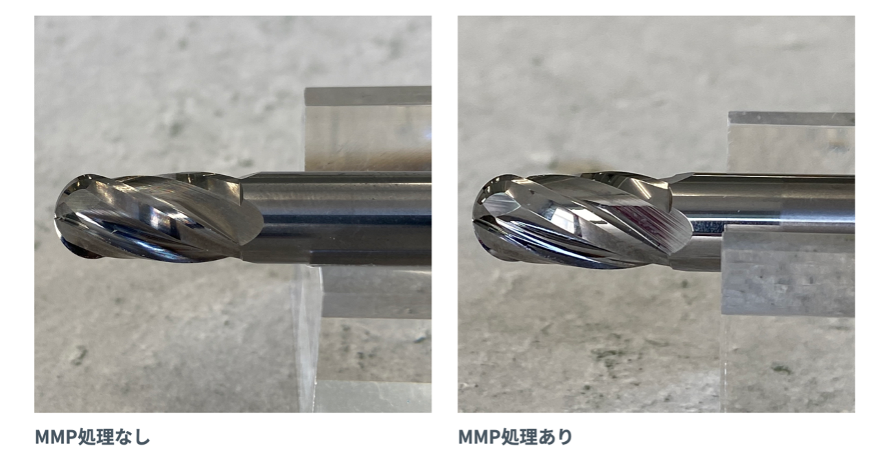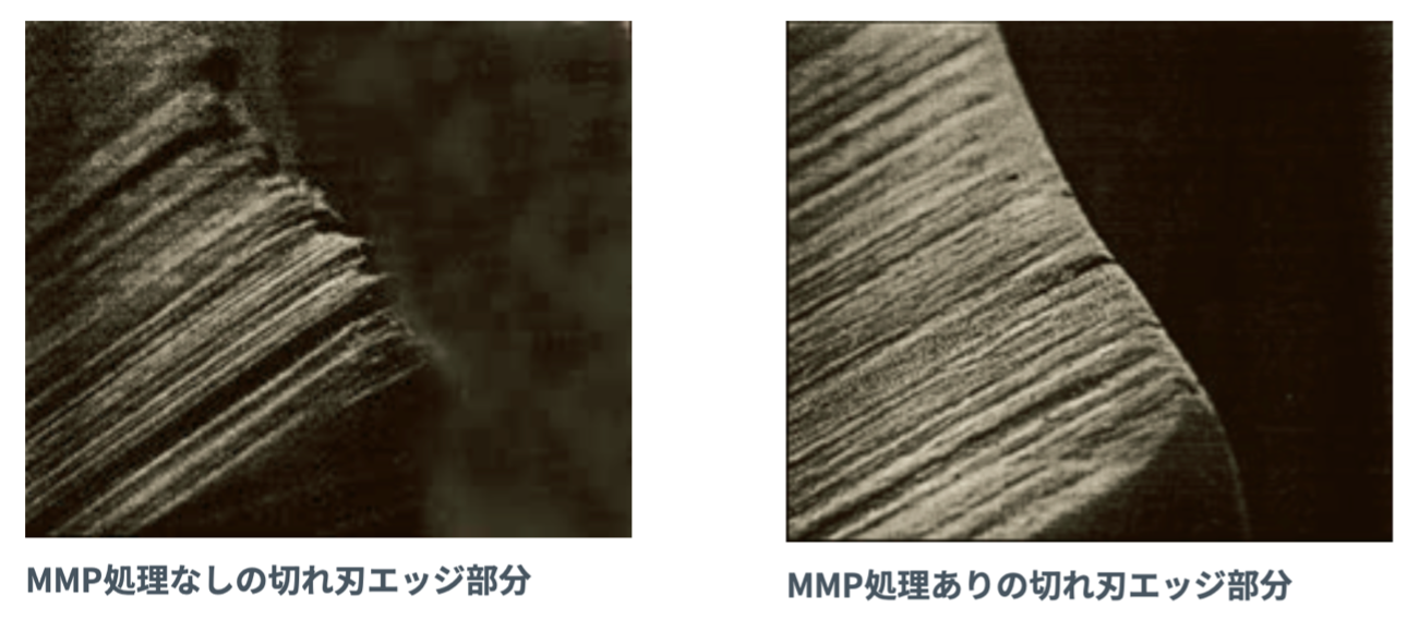 切れ刃のガタつきを滑らかにすることで加工が安定したり溶着を予防したり、MMP処理は元々の刃先処理(ホーニングなど)を残したまま、表面を平滑にして切れ味を向上させる技術です。すごいですよね。