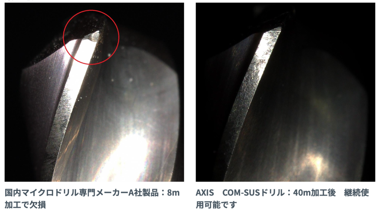 コミニクスさんによる比較テストでは、国内のマイクロドリル専門メーカーA社と比べて「5倍以上の寿命延長」という結果になったようです。