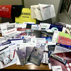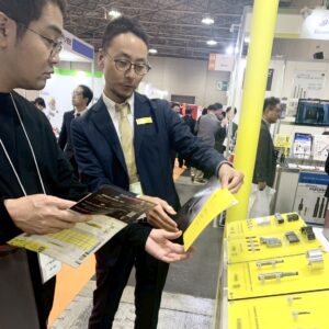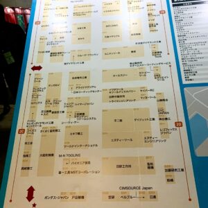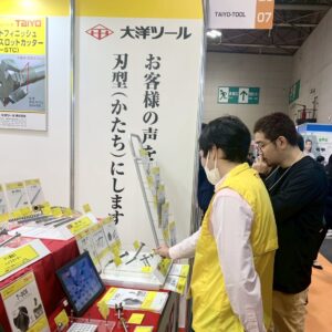 私たちが最初に向かったのは第2展示館。刃物や検査系などのメーカーが並んでいる、いわゆる専務のお目当てゾーンです。今ちょうど探していた刃物があったので、専務と一緒に各ブースで「こういうのありますか?」「こんなことできますか?」と聞いて回りました。いくつかのメーカーさんが後日、サンプルを送ってくださるそうです。