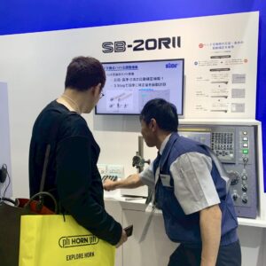 最後は、いつもお世話になっているシチズンマシナリーさんのブースへ。今回は、機械の中に3つの部品をはめ込んでレーザー文字を刻印する一発加工の実演を見させていただきました。シチズンさんの凄さを見せつけられて、専務は唸っていました。